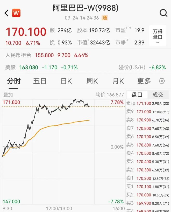 9月24日,阿里巴巴(9988.HK)港股迎来强势爆发,午后股价一度飙涨近8%。截至下午2点25分富鑫中证,阿里巴巴港股报170.1港元/股,涨幅为6.71%,创下2021年10月以来新高,总市值来到3.24万亿港元。
