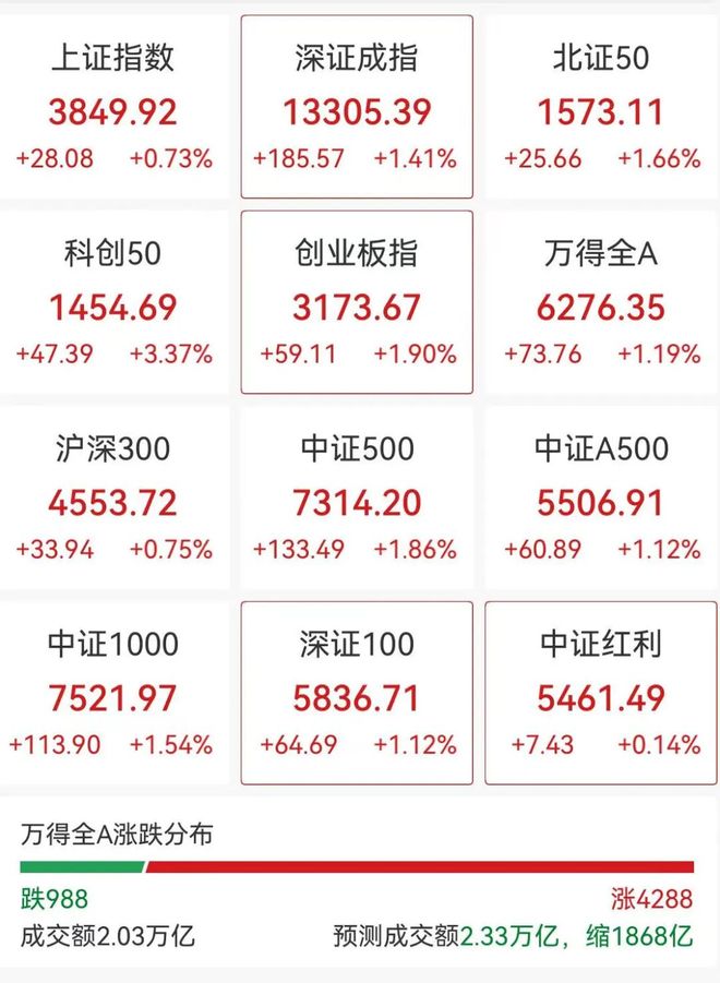 9月24日午后,A股指数继续走强,截至下午2点25分,创业板指涨1.9%,沪指涨0.73%,深成指涨1.41%。半导体芯片、固态电池、房地产等板块涨幅居前,全市场近4300只个股上涨。