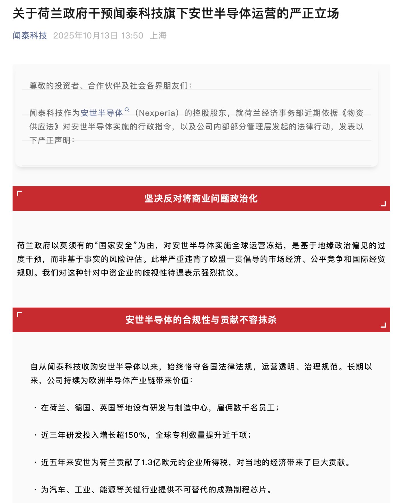 对此,闻泰科技10月13日下午在官微发布严正声明,直指荷兰政府“以莫须有的‘国家安全’为由,对安世半导体实施全球运营冻结,是基于地缘政治偏见的过度干预,而非基于事实的风险评估。此举严重违背了欧盟一贯倡导的市场经济、公平竞争和国际经贸规则。”